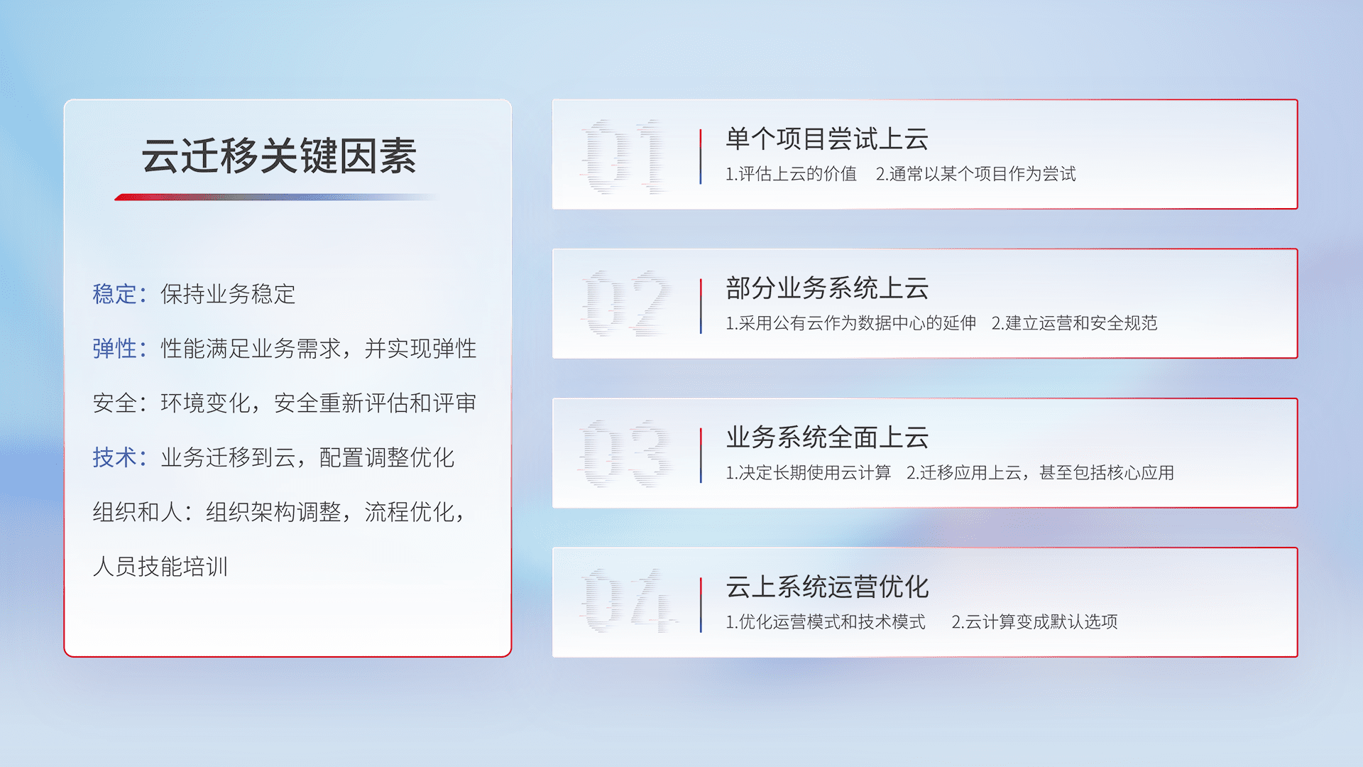 结合实际业务,,从规划设计、、、、云平台选型、、云原生改造、、、、数据迁移、、集成交付,,迁移全过程为客户识别最佳上云路径,,,做好风险识别管理,,,,设计网络架构、、、身份权限、、、、安全审计合规、、、操作审计、、、、日志审计、、监控告警策略、、多站点容灾设计等,,,,对云上基础设施进行整体规划,,,,提升IT治理水平,,以满足弹性、、高可用、、、高性能的需求。。。。