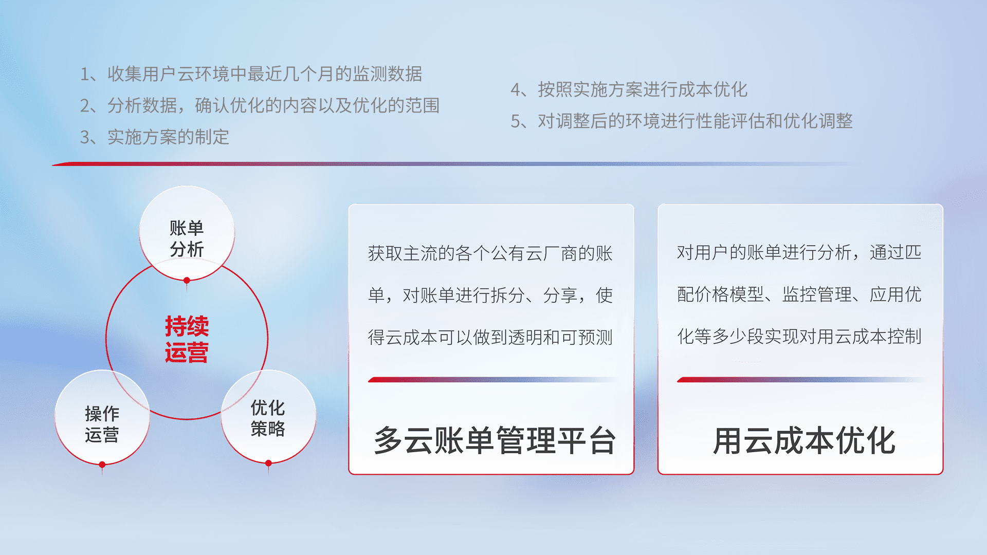 通过多云纳管,,以统一的资源数据模型把客户的云资源进行抽象和封装,,,进而实现对多云资源的统一操作,,,保障云资源管理的可靠性、、稳定性与可用性。。。。量身定制化运维内容,,,,配置、、、、开发运维、、、、补丁管理、、、备份、、、监控、、、认证和访问管理、、、、审计和日常巡检等,,保障在用云过程中的可靠度,,,稳定度以及高可用率。。。。