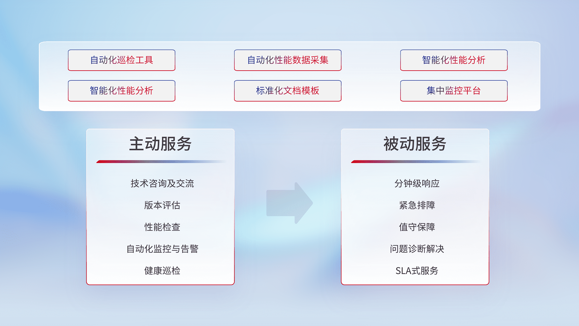 智能化工具和标准化文档,,保障服务质量,,提供主动服务(包含技术咨询、、版本评估、、、、性能检查、、、自动化监控与告警、、、健康巡检)和被动服务包含(分钟级响应、、紧急排障、、值守保障、、、、问题诊断解决、、、SLA服务)。。。。